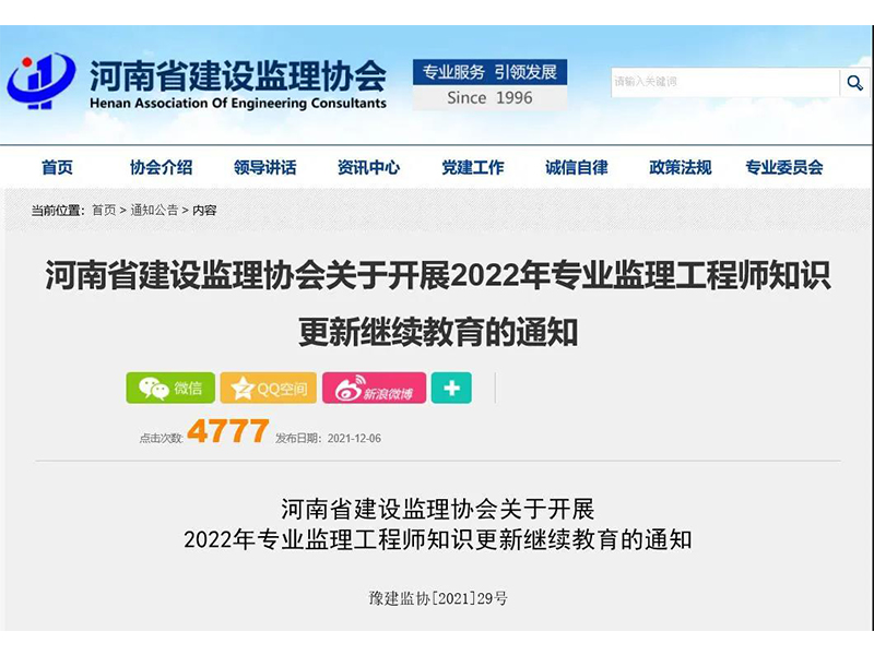 【通知公告】河南省建設(shè)監(jiān)理協(xié)會(huì)關(guān)于開展2022年**監(jiān)理工程師知識(shí)更新繼續(xù)教育的通知詳情>>